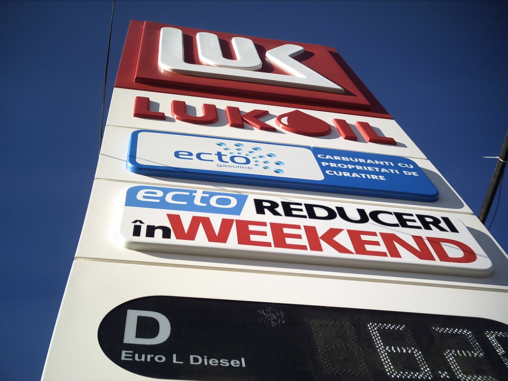 Simboluri elegante plasate in exteriorul cladirilor sau benzinariilor, afisand diferite reclame.